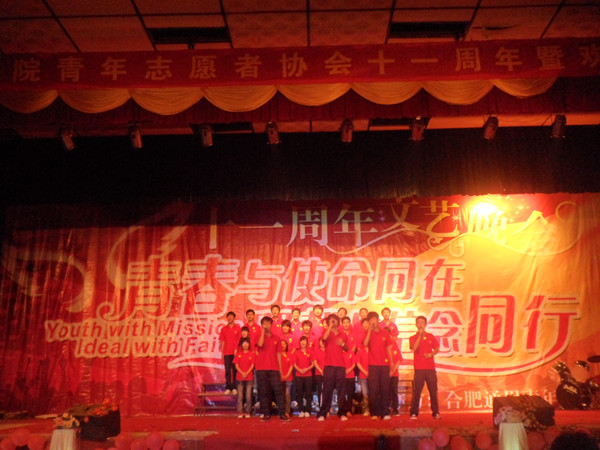 在院团委的大力支持和正确领导下,我院青年志愿者协会开展了一系列广受好评的志愿服务活动,在学院乃至合肥市产生了较大影响。为隆重热烈地纪念青年志愿者协会成立十一周年,2011年6月15日晚19:00时,我院青年志愿者协会十一周年庆典晚会在大学生活动中心隆重举行。合肥通用职业技术学院党委副书记、副院长田启昌,学院各系党团负责同志及学生处、团委负责同志与全院同学共同观看了演出。