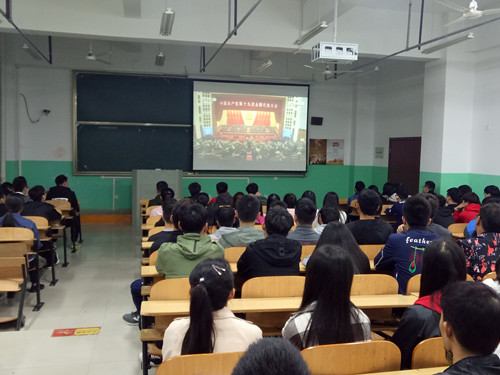 2017年10月18日,学院团委组织团学干部在107教室观看十九大开幕会盛况。第十九次全国代表大会的主题是:不忘初心,牢记使命,高举中国特色社会主义伟大旗帜,决胜全面建成小康社会,夺取新时代中国特色社会主义伟大胜利,为实现中华民族伟大复兴的中国梦不懈奋斗。