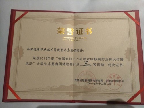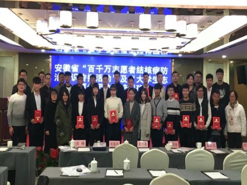 2017年12月1日至3日在合肥市包河区CEO国际酒店,由安徽省结核病防治研究所和安徽省防痨协会主办的“安徽省百千万志愿者结核病防治知识传播活动评选以及大学生志愿团队培训”活动中,我校青年志愿者协会受合肥市疾控中心以及蜀山区疾控中心举荐,参加了此次活动,我校青年志愿者协会会长孙程杰和外联部部委陈志豪受邀参加了此次活动。