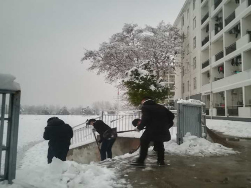 1月5日。我院学生拉动小伙伴自发地组织铲雪。虽然雪积的比较厚,但这一点也没有影响参与者的热情和工作效率,大家分工明确,铲的铲,扫的扫,学校的主干道、俱乐部门口以及操场的楼梯等处积雪被清理干净。