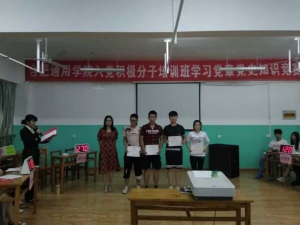 为深入学习贯彻党的十九大精神,引导和促进我院入党积极分子铭记历史,深入学习党史和新党章的理论知识,检验第三十四期党校学员对党的基本理论知识的学习成果,进一步提高全体入党积极分子的思想政治理论素质,我院党校于6月11日19:00在综合教学楼815教室举行第三十四期入党积极分子培训班学习党史党章知识竞赛。机械系团总支书记张连娟老师,数控系辅导员张子老师,学生处汤雪花老师、吴令娴老师和刘璐老师出席并观看了比赛,吴令娴老师担任仲裁委员会主席。
