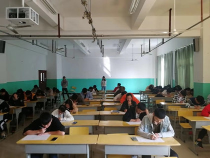 本次比赛的方式为笔试,以班级为单位学习《学生手册》并选拔人员参加。比赛共220人参加,历时一个半小时。考试级前工作人员将桌椅摆好,考试时大家都在认真答题,保持考场安静。随着时间一分一秒过去,考试时间结束。